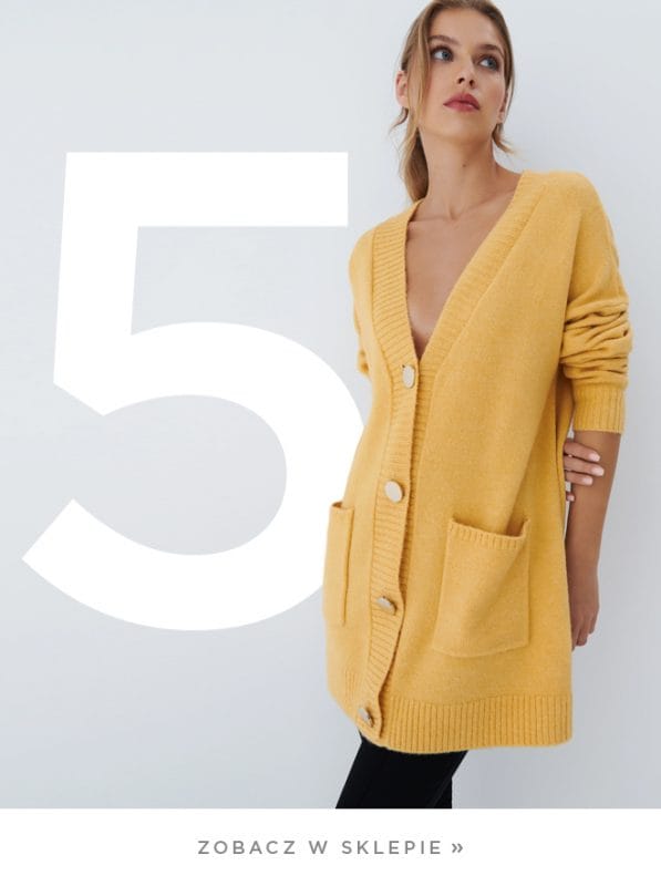 Codzienny, jesienny outfit nie może obyć się bez kardigana w złocistym kolorze, kojarzącym się ze spadającymi liśćmi z drzew. Sweter posiada dwie kieszenie, dlatego na co dzień jest bardzo funkcjonalny i wygodny. Duże, złote guziki dodadzą charakteru całej stylizacji i mogą być elementem biżuteryjnym. W sklepie znajdziecie także inne kolory tego modelu: morski oraz szary.