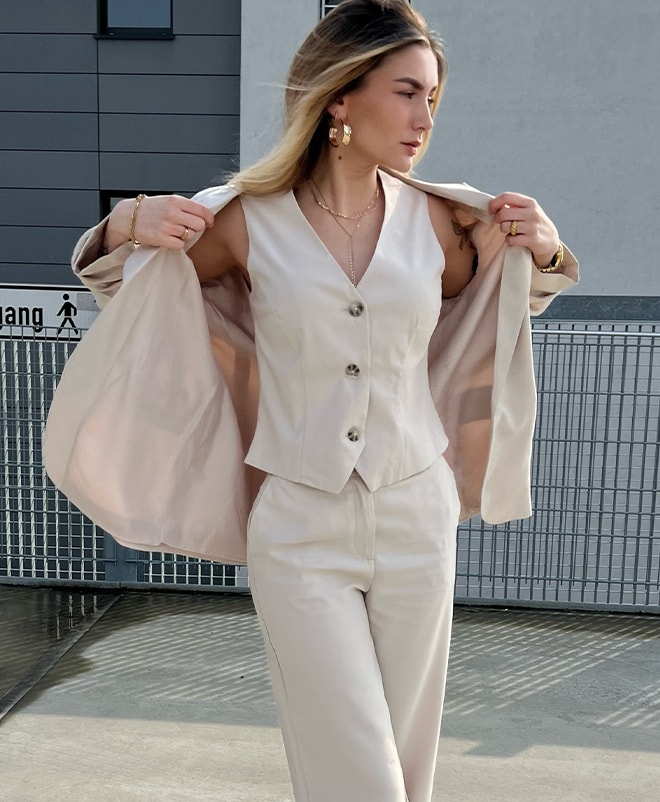 Influencerka postawiła na beżową kamizelką, którą zestawiła z klasyczną marynarką oraz spodniami z szeroką nogawką, tworząc elegancki look, który świetnie sprawdzi się do pracy czy na nieco luźniejsze spotkanie z przyjaciółmi. Do swojej stylizacji dobrała beżowe buty na platformie oraz minimalistyczne dodatki w złotym kolorze. Taka stylizacja jest kwintesencją miejskiego szyku!