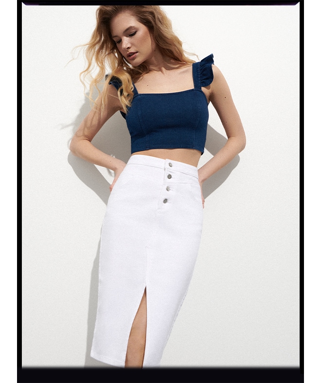 W tym sezonie do łask wracają jeansowe spódnice midi, które koniecznie powinny znaleźć się w Twojej garderobie! Klasyczny jeans, jasny, a może białe opcje? Wybór należy do Ciebie! W MOHITO znajdziesz szeroki wybór spódnic o długości midi, które możesz łączyć z wieloma elementami.