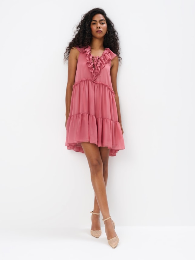 Sukienka o długości mini z falbanami. Posiada długie rękawy i dekolt V.