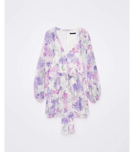 My proponujemy kombinezon damski w kolorze liliowym, z bufiastym rękawem, wiązaniem i wzorem w kwiaty. Do swojej stylizacji dobierz jasne sandały na szerokim obcasie i małą torebkę, która genialnie podkreśli Twój look. To idealna stylizacja na wesele latem!