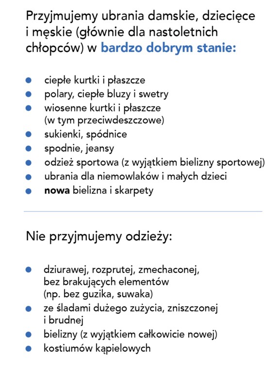 Pomoc zawsze powinna płynąć od serca, a nie być tylko okazją do pozbywania się rzeczy zniszczonych i niepotrzebnych. Bardzo często podczas zbiórek do organizacji trafiają ubrania i buty, które są tak zużyte, że nadają się wyłącznie do utylizacji, lub w danym momencie kompletnie nie odpowiadają zgłoszonemu zapotrzebowaniu. Celowa pomoc to taka, która gromadzi rzeczy z jasno określonej grupy i jest przeznaczona dla konkretnych odbiorców, którzy faktycznie tej pomocy potrzebują. Zwykłe pozbywanie się odzieży i obuwia, które nie nadaje się już do użytku, nie tylko nikomu nie pomaga, ale dostarcza dodatkowej pracy wolontariuszom zaangażowanym w projekty. Bardzo ważne jest zatem, aby myśląc o realnej pomocy, którą chcemy obdarować potrzebujących, przekazywać takie ubrania, które sami chcielibyśmy założyć i buty, w których chcielibyśmy chodzić. Przekazywane rzeczy powinny być zdatne do użytku – w dobrej jakości i zadbane. Szczególnie teraz, kiedy do Polski przybywa dużo kobiet z dziećmi, które niejednokrotnie są zmuszone porzucić swoje walizki po drodze lub zostawić je na peronie, powinniśmy dołożyć wszelkich starań, aby nasza pomoc była trafiona i wiarygodna.