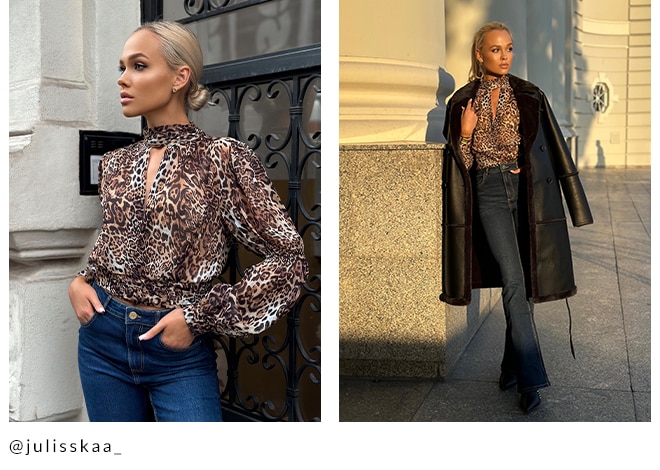 Chcąc stworzyć total look na randkę, zdecyduj się na ołówkową spódnicę midi i wysokie kozaki. Outfit na wieczór z przyjaciółkami? Bluzka z printem w panterkę będzie świetnie wyglądać połączona z jeansami skinny lub woskowanymi spodniami. Baw się panterkowym wzorem i twórz ciekawe stylizacje!