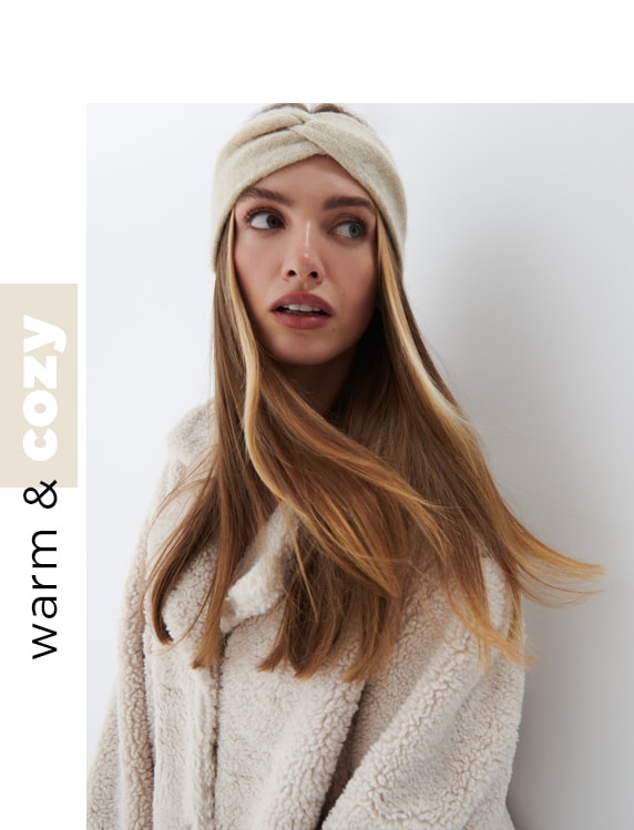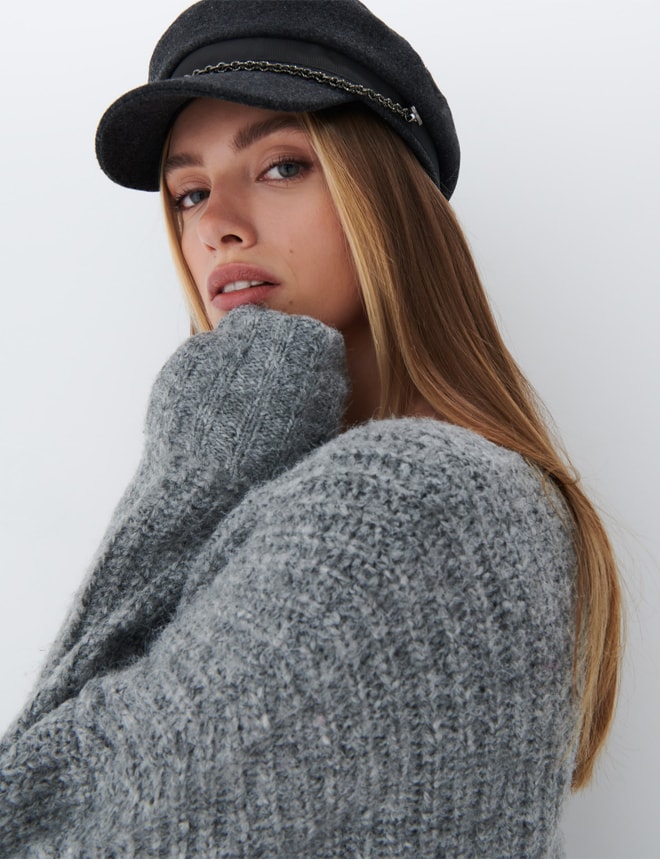 W mroźne dni warto zadbać o to, aby było nam ciepło, dlatego w Twojej garderobie powinno znaleźć się chociaż jedno nakrycie głowy. W MOHITO znajdziesz wiele stylowych dodatków, które dopełnią każdy zimowy look. Szara czapka z daszkiem typu bosmanka to hit od kilku sezonów. Delikatne zdobienie w postaci łańcuszka na przodzie dodaje bosmance elegancji i modowego akcentu. Kolejnym must havem jest opaska wykonana z ciepłej i grubej dzianiny. W połączeniu z płaszczem „barankiem” tworzy przytulną i ciepłą stylizację.