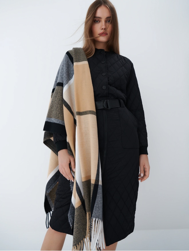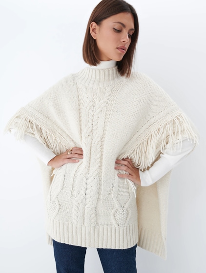Ponczo jest to niezwykle funkcjonalny dodatek. Wczesną jesienią możemy nosić go swobodnie zarzucone na sweter, a później, gdy robi się już chłodniej jako duży szal założony na kurtkę lub płaszcz. Jest to kolejne okrycie, które ogrzeje nas podczas mroźnych dni. W MOHITO opcji mamy wiele — od eleganckich modeli, po te casualowe. Pierwszą propozycją jest ponczo w kratę z zapięciem przy szyi. Idealnie będzie pasować do płaszcza w klasycznym stylu, zarzucone jako szal. Na uwagę zasługują modele z golfem lub stójką, które zakładamy przez głowę. Bez problemu posłużą nam jako element garderoby, który możemy nosić na koszulę lub bluzkę. Dodatkowo frędzle sprawiają, że cała stylizacja nabiera niesamowitego boho klimatu. Jeśli jesteś fanką stonowanych kolorów wybierz swetrowe ponczo w czarnym lub szarym odcieniu. Z pewnością będzie Ci w nim bardzo ciepło!