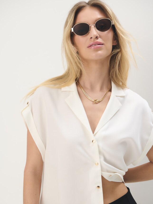Prima noastră propunere este un look în nuanțe deschise. Poți să-l porți la muncă sau la o ieșire elegantă. Dacă dorești o ținută pentru zi cu zi, schimbă topul cu un tricou de bumbac basic și adaugă o jachetă de blugi deasupra. Accesoriile minimaliste, cum ar fi o poșetă mică și cercei, se vor potrivi perfect cu această ținută.